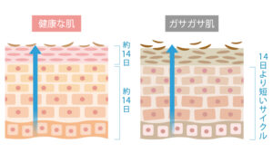健康な肌では、28日かけて育った角層がしっかりバリア層を形成し、古くなった角層が垢となって剥がれ落ちています。一方で、28日よりも短い周期でターンオーバーを繰り返した角層ははがれやすく、脆弱な状態になりバリア機能が低下しています。その結果、外部刺激に弱く、うるおいがキープできないため乾燥しやすくなり、さらに新たな炎症がおこりやすいという悪循環に陥ってしまいます。